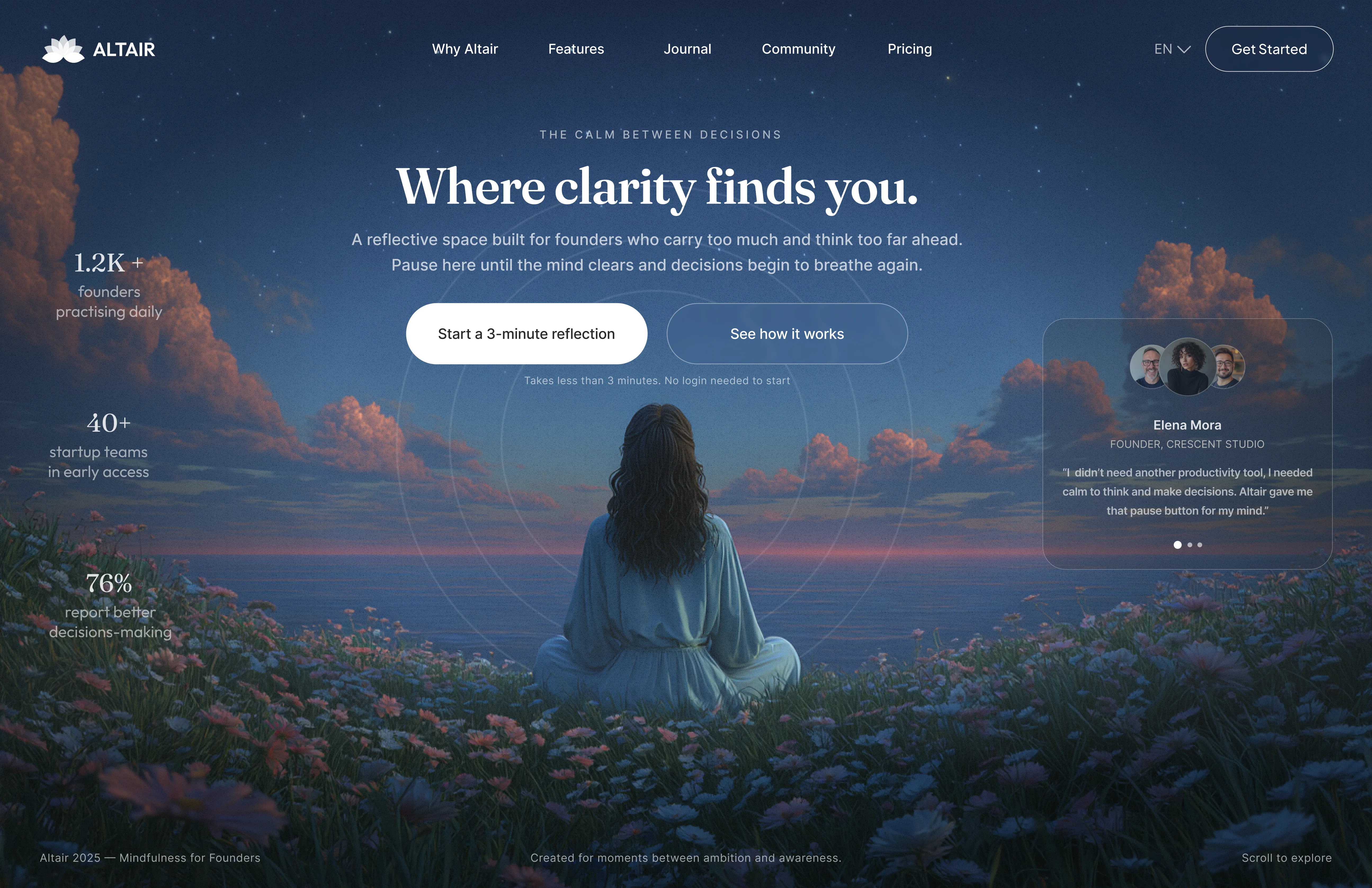 Most startup sites list features. Mine make people feel the problem before they're sold the solution. Every section, layout, and visual is designed to move a visitor through a specific arc: recognition, trust, action. Good product. Right design. Inevitable decision.